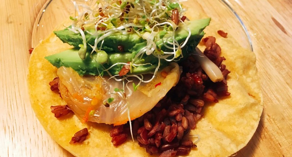 Vegan kimchi takes this taco to another level. The red rice adds color and lovely contrast to the creamy green avocado. Homegrown sprouts make it so fresh you’ll float. Ingredients for 1 serving: 3 soft corn tortillas 1/8 cup cooked red rice 1/2 a ripe avocado 2 Tbsp vegan kimchi 3 pinches of sprouts Lightly toast the tortillas in a toaster oven or on a flame on your stove top Top each tortilla with 1/3 of the ingredients above