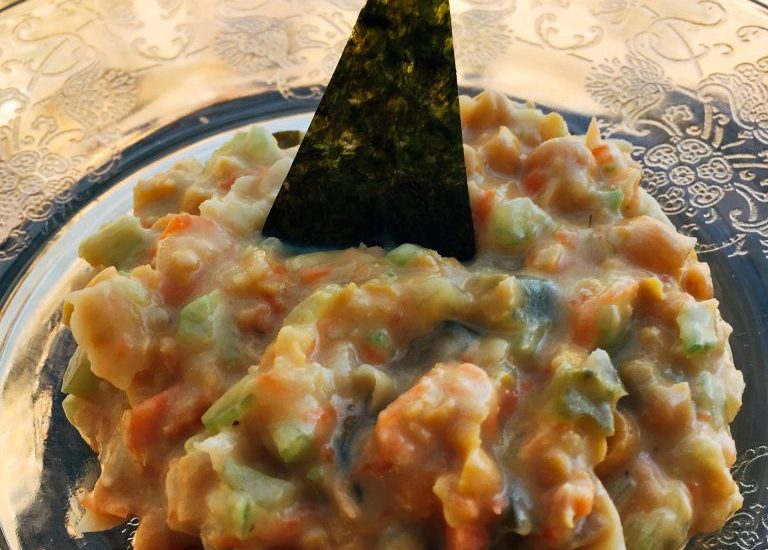 This chickpea eggless egg salad makes a great sandwich, wrap or side dish. Serve it with roasted purple sweet potatoes for a beautiful color combination. Ingredients: 1 cup of cooked chickpeas 1 Tbsp dijon mustard 1/8 cup vegan mayonnaise (very naughty) 1/8 cup diced pickles 3 Tbsp pickle juice 1 medium sized shredded carrot 2 stalks of celery diced 1 sushi-size sheet of nori crumbled sea salt to taste Mash the chickpeas with a fork or potato masher Combine all other ingredients Enjoy cold with homegrown alfalfa sprouts in a wrap or warm with roasted potatoes